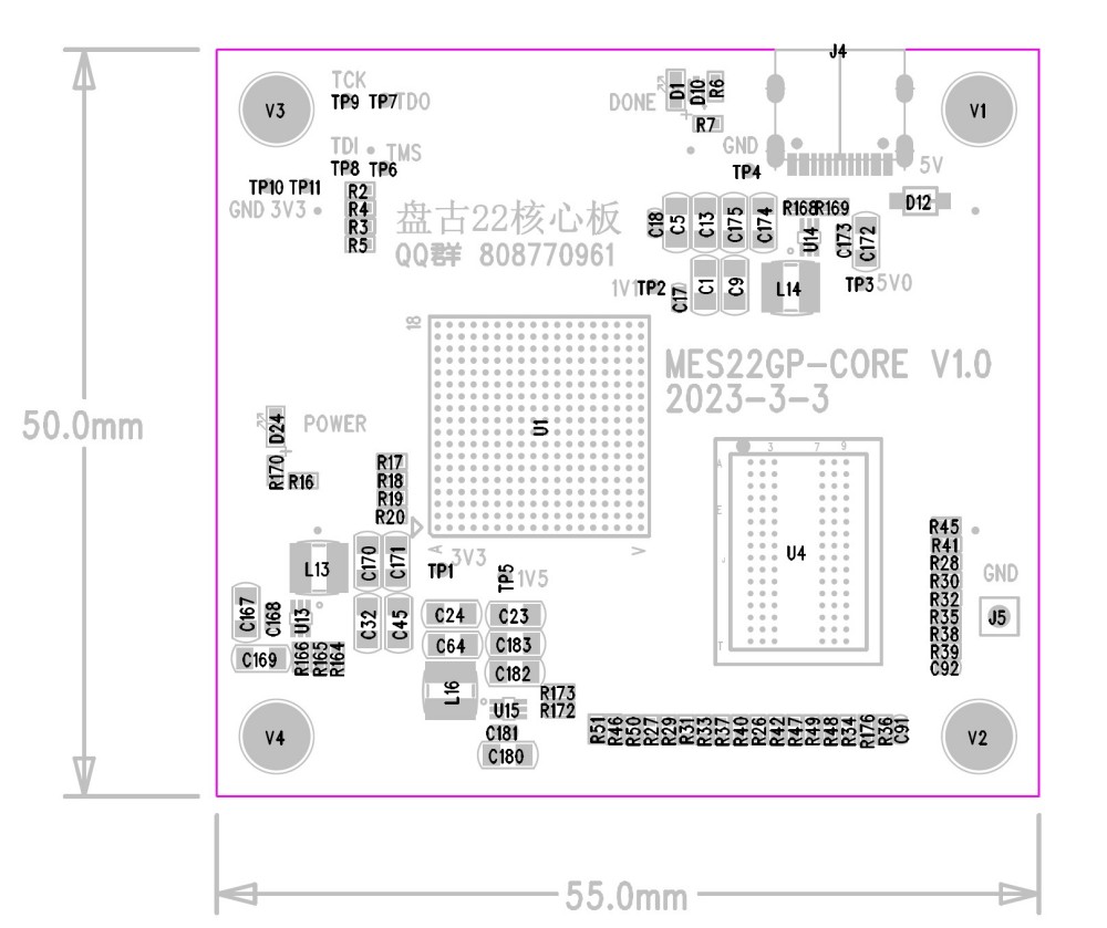 盘古22K核心板尺寸仅为50*55mm,扩展出16个1.5V电平标准的用户IO,136个3.3V电平标准的用户IO,并且FPGA的差分对到扩展口之间均做了等长处理,非常适合二次开发。