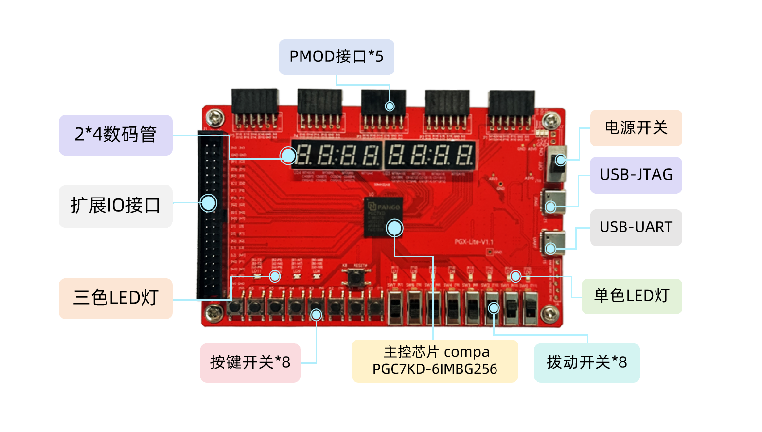 PGX-Lite 7K 开发板基于紫光同创低功耗CPLD器件PGC7KD-6IMBG256,支持主自加载双启动功能,集成板载Jtag调试接口,支持Type-C转串口通信,预留丰富的扩展IO、数码管、按键、LED等硬件资源,满足用户更加灵活的应用需求。